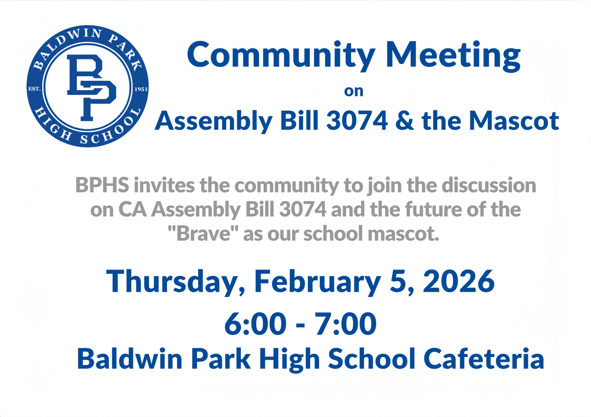 BPHS will have a community meeting on Thursday, February 5, at 6:00 to discuss the California Assembly Bill and what it means for our school's mascot the "Brave". This meeting is open to our students, staff, parents, and community at large.
